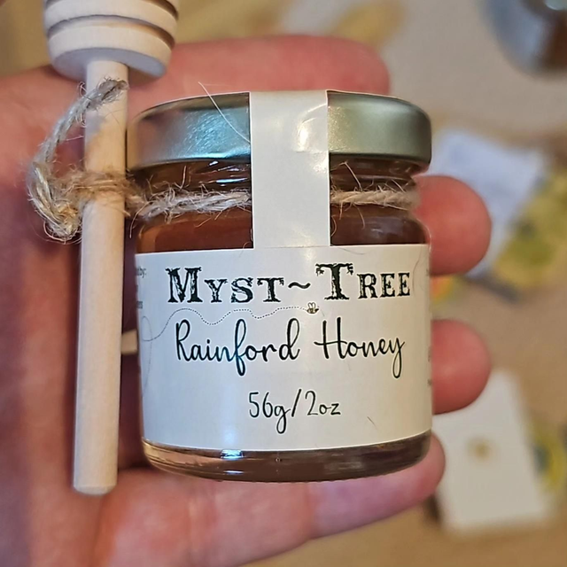 A sweet little gift for anyone who loves real honey. Each set includes a 56g jar of our 100% natural, unfiltered Rainford honey and a small wooden honey dipper, tied together with rustic twine for a simple, eco-friendly finish. Perfect as a stocking filler, party favour, or thank-you gift.